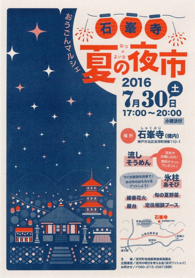 そんな色々な思いを持って、淡河町にある石峯寺というお寺さんで「夏の夜市」を開きます。